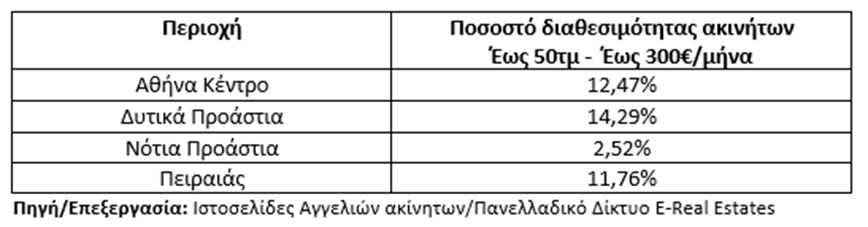 Στις περιοχές του κέντρου των Αθηνών, οι κατοικίες άνω του 1ου ορόφου έως 50 τ.μ. που διατίθενται με ζητούμενο μίσθωμα έως 300 ευρώ, αποτελούν μόλις το 12,47% (κυρίως γκαρσονιέρες 21τμ-30τμ) επί του συνόλου των διαθέσιμων προς μίσθωση κατοικιών άνω του 1ου ορόφου έως 50τμ. Δηλαδή 1 στις 10 κατοικίες κατάλληλες για φοιτητές διατίθενται με μίσθωμα έως 300 ευρώ στην Αθήνα.