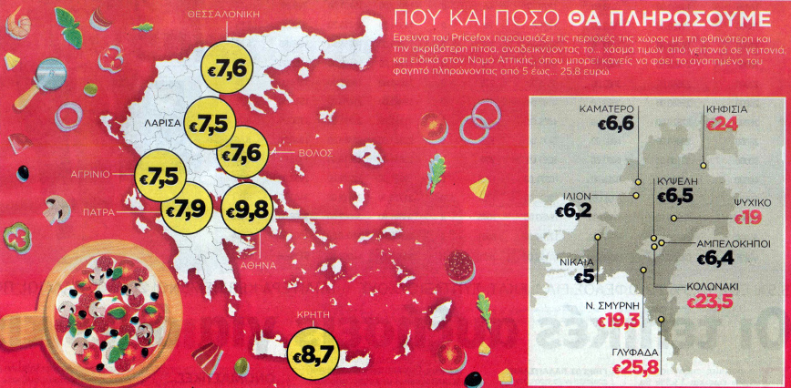 - Στη Θεσσαλονίκη μπορεί να φάει κανείς πίτσα με 7,6 ευρώ, με τις ακριβότερες να φτάνουν τα 18 ευρώ.