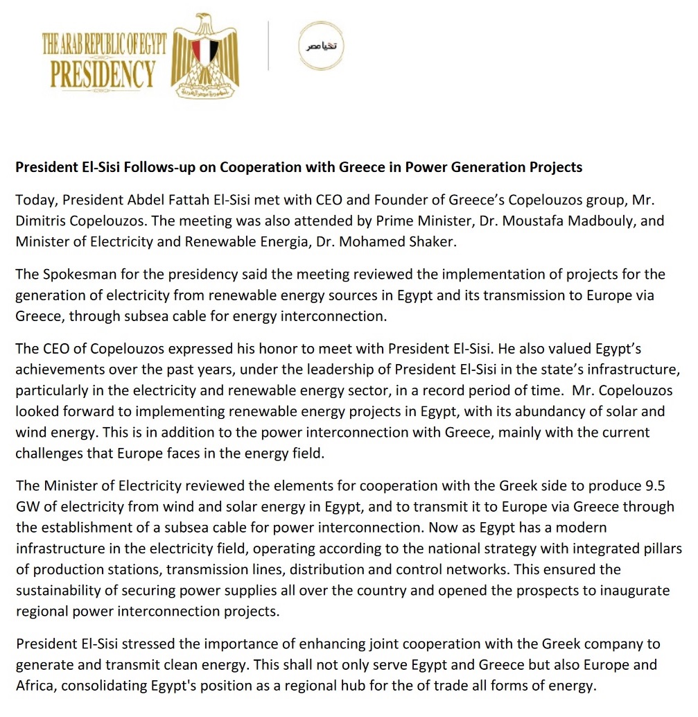 Ο Πρόεδρος El-Sisi τόνισε την σπουδαιότητα της ενίσχυσης της κοινής συνεργασίας με την Ελληνική εταιρεία για την παραγωγή και μεταφορά καθαρής ενέργειας. Η συνεργασία αυτή δεν θα εξυπηρετεί μόνο την Αίγυπτο και την Ελλάδα αλλά και την Ευρώπη όπως επίσης και την Αφρική, εδραιώνοντας τη θέση της Αιγύπτου ως ενός εμπορικού περιφερειακού κόμβου για όλες τις μορφές ενέργειας.