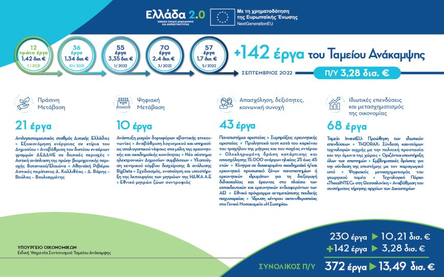 Σε 13,5 δισ. ευρώ ανέρχεται ο συνολικός προϋπολογισμός των 372 έργων που έχουν ενταχθεί, προς το παρόν, στο σκέλος των επιδοτήσεων του Εθνικού Σχεδίου Ανάκαμψης και Ανθεκτικότητας «Ελλάδα 2.0», το οποίο βρίσκεται σε πλήρη εξέλιξη. Στα 230 έργα, που είχαν ανακοινωθεί έως τον Μάιο του 2022, προστέθηκαν ακόμη 142 έργα, συνολικού προϋπολογισμού 3,28 δισ. ευρώ, τα οποία εντάχθηκαν στο «Ελλάδα 2.0», με αποφάσεις που υπέγραψε ο αρμόδιος για την υλοποίησή του, αναπληρωτής υπουργός Οικονομικών, Θόδωρος Σκυλακάκης.
