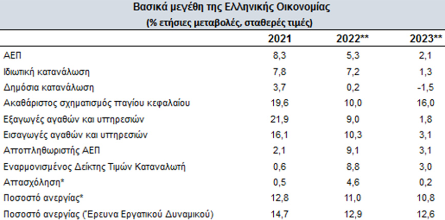 Η εκτίμηση για την πορεία του πραγματικού ΑΕΠ στο σύνολο του έτους 2022 διαμορφώνεται σε 5,3%, υψηλότερα από ό,τι είχε προβλεφθεί στο Πρόγραμμα Σταθερότητας 2022 και στον κρατικό προϋπολογισμό 2022, κατά 2,2 και 0,8 ποσοστιαίες μονάδες, αντίστοιχα. Η προς τα πάνω αναθεώρηση του πραγματικού ΑΕΠ σχετίζεται με την καλύτερη του αναμενόμενου επίδοση της ελληνικής οικονομίας στο πρώτο εξάμηνο του έτους, από κοινού με την προς τα πάνω αναθεωρημένη εκτίμηση για τις ετήσιες τουριστικές εισπράξεις και αυξημένο ύψος μέτρων στήριξης για την αντιμετώπιση της ενεργειακής κρίσης.