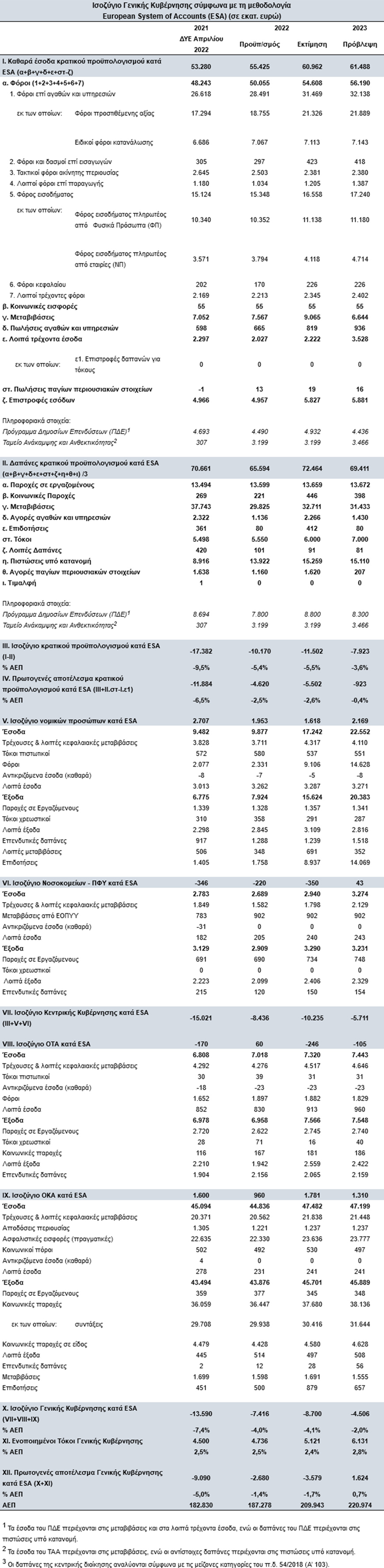 Στο ανωτέρω αποτέλεσμα, για το 2023 έχει συμπεριληφθεί το σύνολο των δημοσιονομικών μέτρων, ύψους 3,5 δισ. ευρώ, που εξαγγέλθηκαν στη Διεθνή Έκθεση Θεσσαλονίκης και επιπλέον 1 δισ. ευρώ αποθεματικό για αυξημένες δαπάνες αντιμετώπισης της ενεργειακής κρίσης, πρωτίστως για την επιδότηση λογαριασμών ηλεκτρικού ρεύματος και την αντιμετώπιση δαπανών των φορέων γενικής κυβέρνησης.