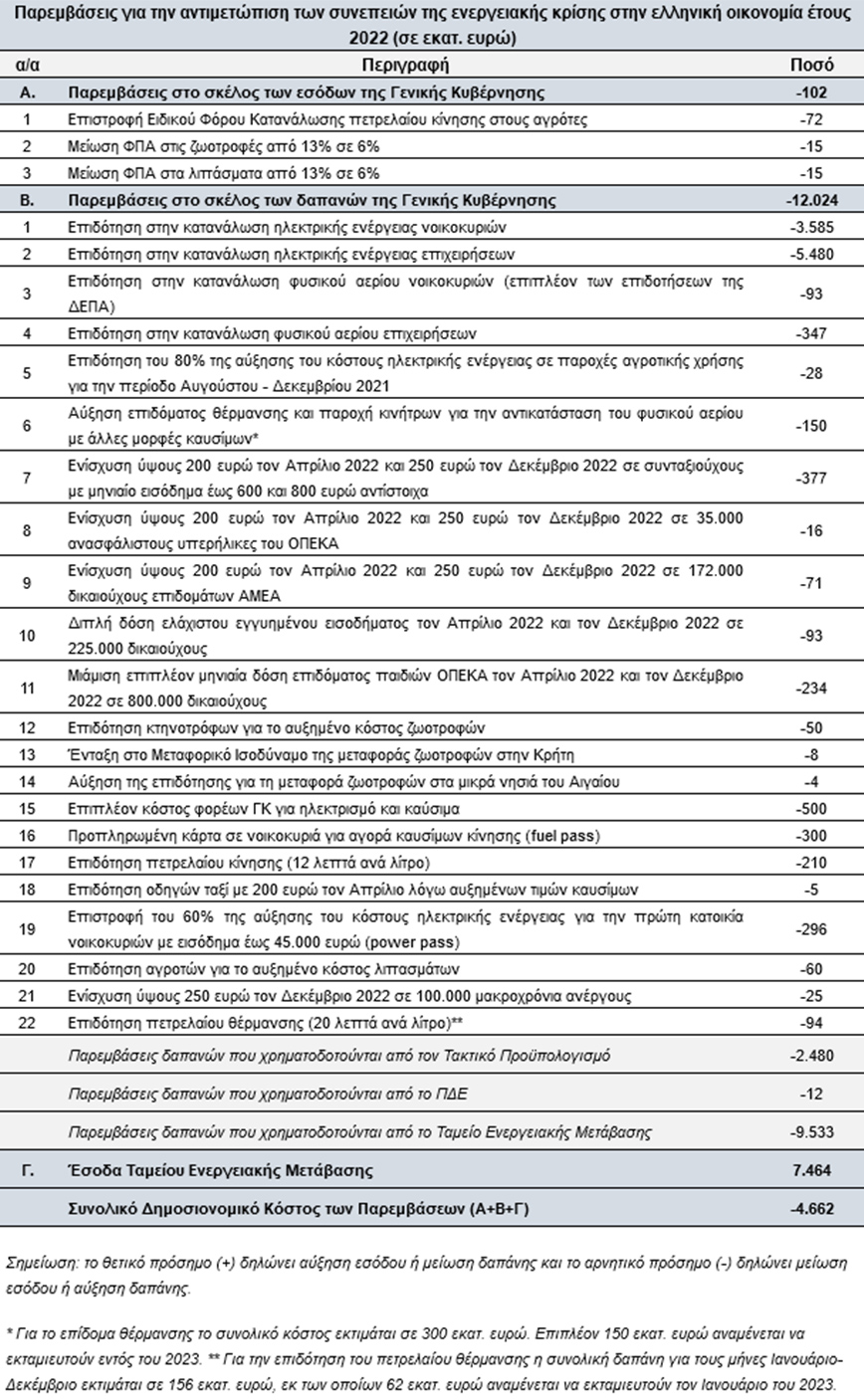 - στην αύξηση του επιδόματος θέρμανσης και στην επιδότηση πετρελαίου θέρμανσης και κίνησης (συνολικό δημοσιονομικό κόστος 453 εκατ. ευρώ), στην εφαρμογή του μέτρου της προπληρωμένης κάρτας για αγορά καυσίμων κίνησης (fuel pass) για συνολικά 6 μήνες, από τον Απρίλιο 2022 έως τον Σεπτέμβριο 2022 (δημοσιονομικό κόστος 300 εκατ. ευρώ),