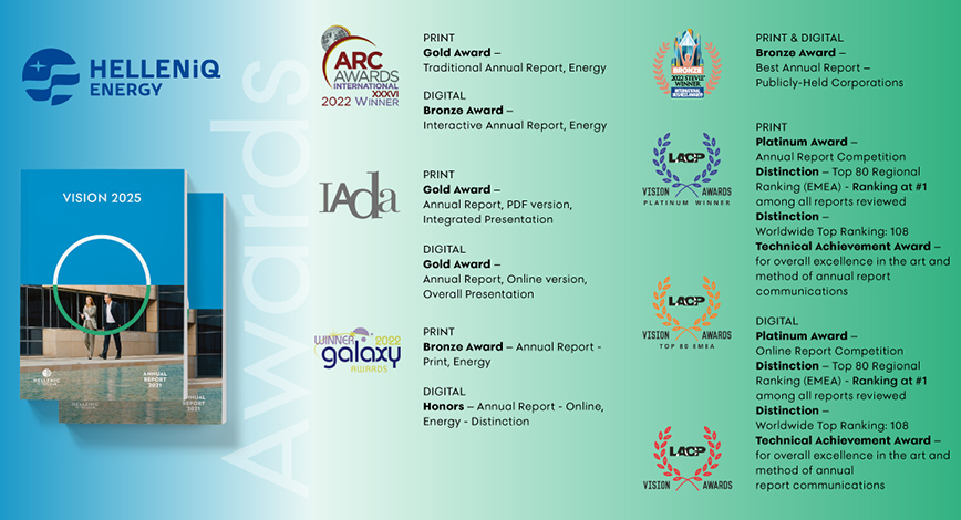 Η HELLENiQ ENERGY τιμήθηκε με το “Gold Award” στην κατηγορία Printed version – Traditional format, Energy & Resources, Integrated Presentation και με το “Gold Award” στην κατηγορία Online version, Energy & Resources, Overall.