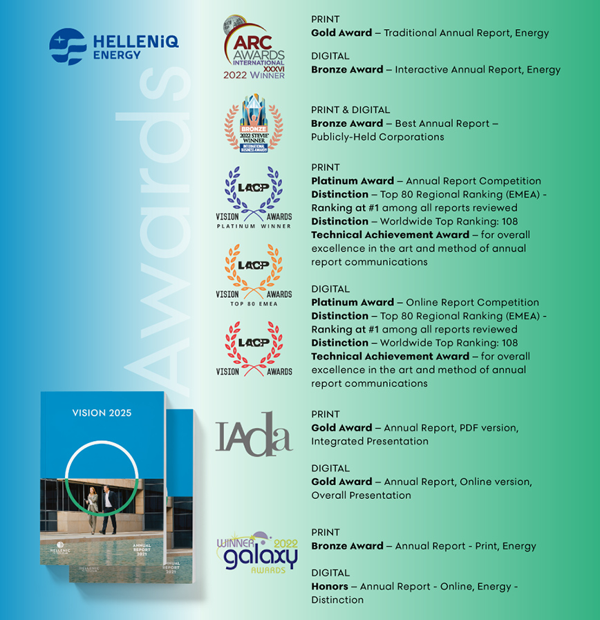 Η HELLENiQ ENERGY τιμήθηκε με το bronze βραβείο στην κατηγορία κλασσικός ετήσιος απολογισμός στον κλάδο της ενέργειας, ενώ απέσπασε τιμητική διάκριση στην κατηγορία ψηφιακός ετήσιος απολογισμός στον ίδιο κλάδο: