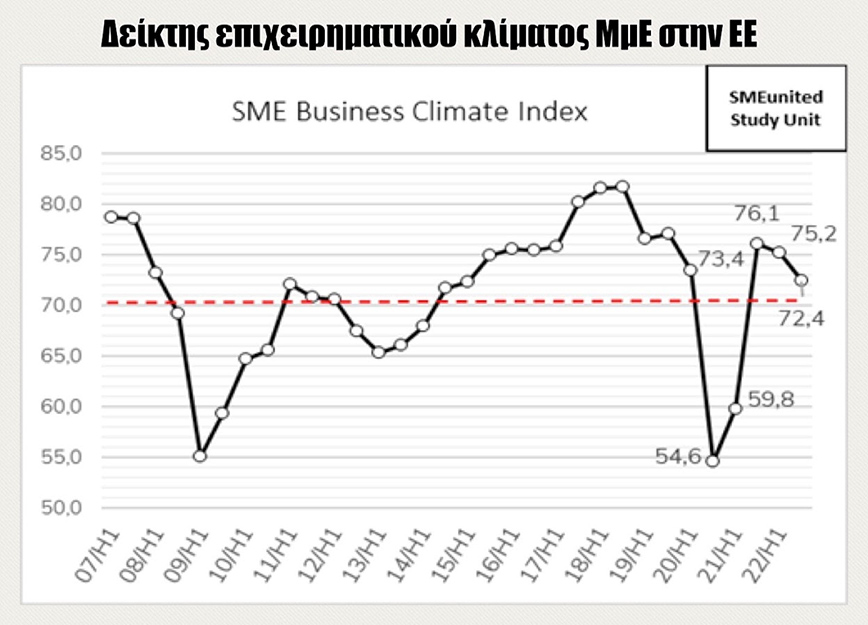 Παρουσιάζοντας τα κύρια ευρήματα του τελευταίου «Βαρόμετρου» των ευρωπαϊκών ΜμΕ, που αξιολογήθηκαν από την «SMEunited Study Unit», προκύπτει ότι, τα αποτελέσματα για το πρώτο εξάμηνο του 2022 ξεπέρασαν τις προσδοκίες, καθώς οι φόβοι για ξέσπασμα παραλλαγών Covid δεν επαληθεύτηκαν. Ωστόσο, τα επενδυτικά αποτελέσματα ήταν χειρότερα από τα αναμενόμενα, λόγω της αβεβαιότητας για το μελλοντικό επιχειρηματικό περιβάλλον. Το τρέχον εξάμηνο παρουσιάζει έντονη αυξανόμενη αβεβαιότητα. Οι αρνητικές προσδοκίες για τον κύκλο εργασιών και τις παραγγελίες οδηγούν σε έντονη πτώση του ύψους των επενδύσεων κατά -16,7%. Ταυτόχρονα, οι προσδοκίες για την απασχόληση παραμένουν θετικές στο +1,2%, υποδεικνύοντας ότι πολλές ΜμΕ στην ΕΕ-27 εξακολουθούν να θέλουν να καλύψουν τις υπάρχουσες κενές θέσεις.