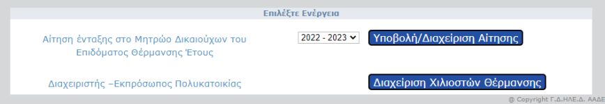 Πολυκατοικίες: Σε περίπτωση που οι δικαιούχοι καταβάλλουν τη δαπάνη θέρμανσης μέσω κοινοχρήστων, τότε καταχωρίζεται, επιπρόσθετα στην αίτηση και ο αριθμός της απόδειξης εξόφλησης κοινοχρήστων ή εναλλακτικά ο αριθμός που φέρει το ειδοποιητήριο πληρωμής αυτών (αν δεν έχει ήδη εκδοθεί κατά την υποβολή της αίτησης απόδειξη εξόφλησης), ο Αριθμός Φορολογικού Μητρώου του διαχειριστή ή του προσώπου που εκπροσωπεί την πολυκατοικία ή της εταιρείας διαχείρισης της πολυκατοικίας, καθώς και το ποσό που αναλογεί στον δικαιούχο.
