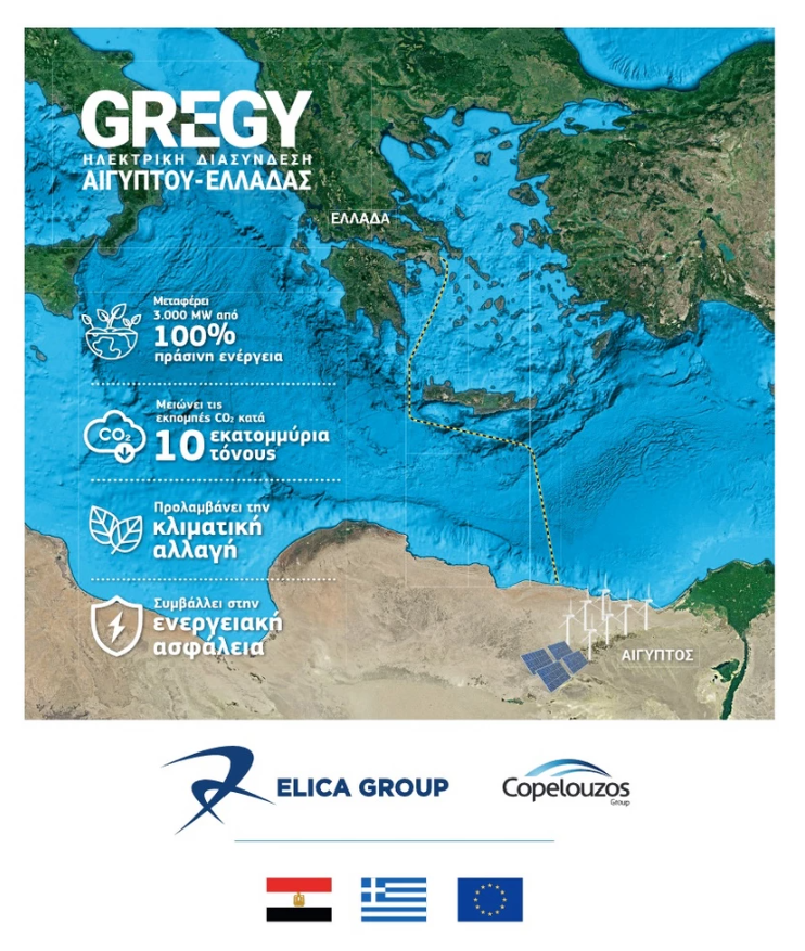 Το έργο «GREGY- INTERCONNECTION» θα είναι δυναμικότητας 3.000 MW και θα διασυνδέει απευθείας την Αίγυπτο με την Αττική, αποφεύγοντας με αυτό τον τρόπο τα περιττά ενδιάμεσα σημεία εκφόρτωσης. Το έργο συνάδει πλήρως με τη στρατηγική της Ευρωπαϊκής Ένωσης για τη μετάβαση στην πράσινη ενέργεια και την επίτευξη μηδενικών εκπομπών CO2 έως το 2050 και αναπτύσσεται από τον επιχειρηματικό Όμιλο Κοπελούζου, μέσω της εταιρείας Elica, της ελληνικής εταιρείας που μετέχει στην σημαντική διάσκεψη COP27.