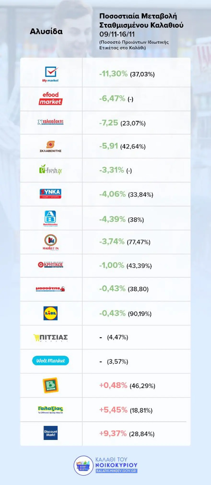 Μάλιστα, το συνολικό κόστος, με βάση τα στοιχεία είναι μειωμένο στις περισσότερες αλυσίδες, με τη μεγαλύτερη υποχώρηση κατά 11,3% στην αλυσίδα My market.