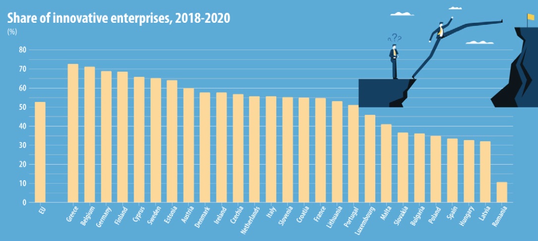 Το υψηλότερο ποσοστό καινοτόμων επιχειρήσεων αναφέρθηκε στην Ελλάδα (73% του συνόλου των επιχειρήσεων), ακολουθούμενο από το Βέλγιο (71%), την Γερμανία και την Φινλανδία (και οι δύο 69%) και την Κύπρο (66%). Αντίθετα, η χαμηλότερη δραστηριότητα καινοτομίας παρατηρήθηκε στην Ρουμανία (11%), την Λετονία (32%), την Ουγγαρία και την Ισπανία (33%) και την Πολωνία (35%).