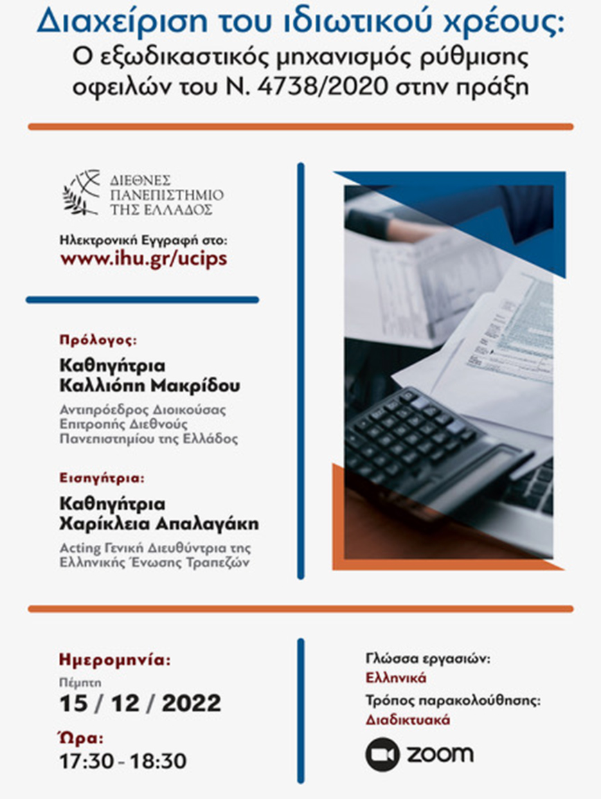 Το Διεθνές Πανεπιστήμιο της Ελλάδος διοργανώνει διαδικτυακή εκδήλωση την Πέμπτη 15/12/2022 από 17:30-18:30 με θέμα «Διαχείριση του ιδιωτικού χρέους: O εξωδικαστικός μηχανισμός ρύθμισης οφειλών του Ν. 4738/2020 στην πράξη».