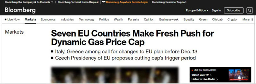 Στις 13 Δεκεμβρίου, οι υπουργοί Ενέργειας καλούνται να καταλήξουν σε μία συμφωνία για το πλαφόν και την ενέργεια, η οποία να επικυρωθεί από τους 27 ηγέτες στη Σύνοδο Κορυφής.