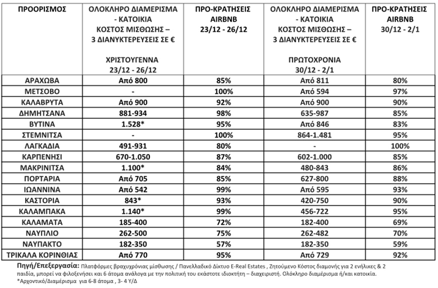 Στα Καλάβρυτα, οι προ-κρατήσεις αγγίζουν το 92% για τα Χριστούγεννα, με τις ζητούμενες τιμές μίσθωσης για ολόκληρο διαμέρισμα ή/και αυτοτελή κατοικία να κυμαίνονται πλέον από 900 ευρώ (από 358 ευρώ έως 881 ευρώ τον Νοέμβριο). «Τα διαθέσιμα προς μίσθωση διαμερίσματα που μπορούσε να αναζητήσει ο εν δυνάμει ταξιδιώτης ήταν κυρίως από 55τμ έως 65τμ. Διαμερίσματα που μπορούν να φιλοξενήσουν έως 4-5 άτομα, ανάλογα πάντα με την πολιτική του εκάστοτε ιδιοκτήτη-διαχειριστή ακινήτου. Πλέον, τα διαθέσιμα προς μίσθωση ακίνητα, είναι μεγαλύτερης επιφάνειας 100 τμ-140 τμ όπου μπορούν να φιλοξενηθούν 7-8 άτομα. Για τις ημέρες της Πρωτοχρονιάς, το κόστος για τρεις διανυκτερεύσεις κυμαίνεται στα ίδια επίπεδα με τις ημέρες των Χριστουγέννων και το ποσοστό προ-κρατήσεων αγγίζει το 97% ( από 82% τον Νοέμβριο)» ανέφερε ο Πρόεδρος του Πανελλαδικού Δικτύου E-Real Estates.
