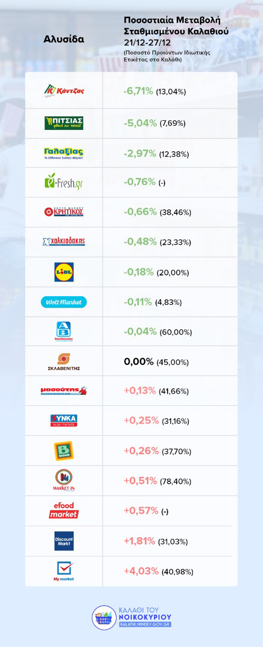 Οι ποσοστιαίες μεταβολές στο «καλάθι του νοικοκυριού» κάθε αλυσίδας αναφέρονται αναλυτικά στο επισυναπτόμενο γράφημα.