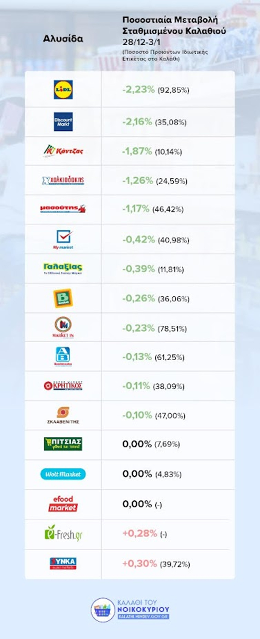Ως εκ τούτου, το συνολικό κόστος του «Καλαθιού του Νοικοκυριού» είναι μειωμένο στη συντριπτική πλειονότητα των σούπερ μάρκετ με τη μεγαλύτερη μείωση -2,23% στην αλυσίδα LIDL.