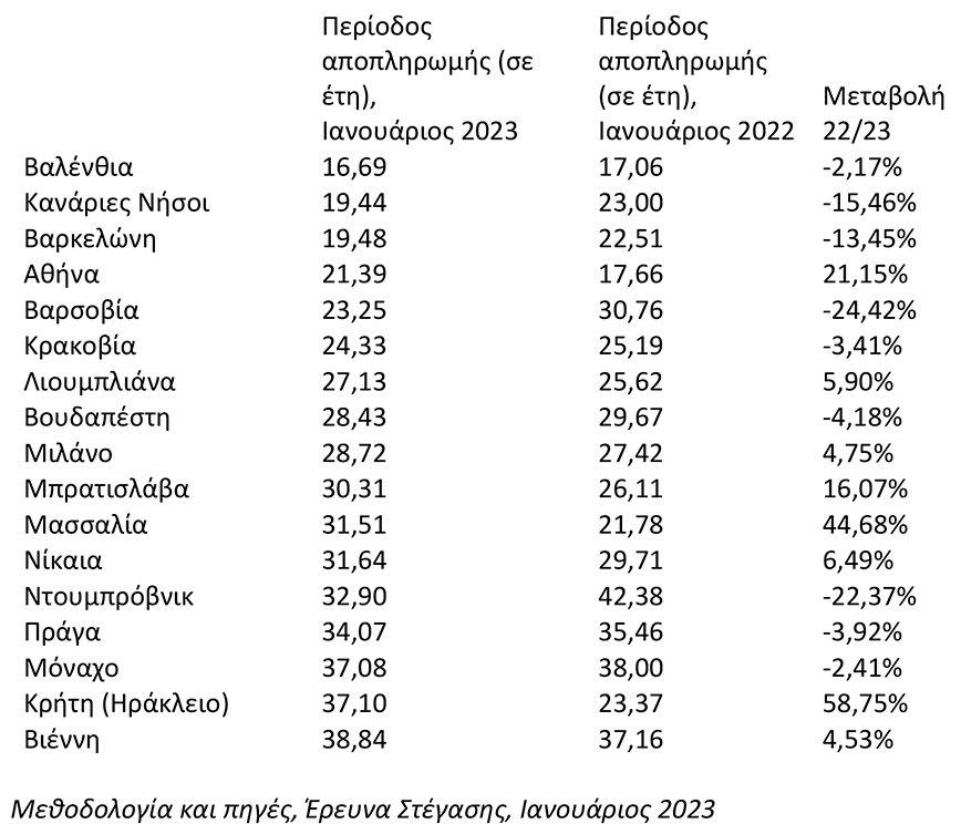 Όπως προκύπτει από το πρόγραμμα σύγκρισης απόδοσης επενδύσεων διαμερισμάτων (Apartment Return On Investment Comparator), η αγορά ενός διαμερίσματος που προορίζεται για ενοικίαση στην Ισπανία προσφέρει την ταχύτερη απόδοση σε έναν επενδυτή. Η Αθήνα ακολουθεί με απόδοση επένδυσης άνω των 21 ετών για ένα ενοικιαζόμενο διαμέρισμα. Πίσω της βρίσκονται μεγάλες πόλεις άλλων χωρών της Κεντρικής και Νότιας Ευρώπης, με τη μεγαλύτερη επιστρεπτέα επένδυση να προσφέρεται στη Βιέννη στα 39 χρόνια. Τα στοιχεία από το Ηράκλειο έδειξαν τη μεγαλύτερη αύξηση των αποδόσεων μέσα σε έναν χρόνο, λόγω της δραματικής ανόδου των τιμών των διαμερισμάτων στην πρωτεύουσα της Κρήτης.