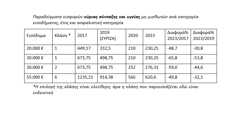 Τρίτον, διότι το ασφαλιστικό μας σύστημα οφείλει να λειτουργεί με όρους δικαιοσύνης και αναλογικής κατανομής των βαρών, με βάση τις δυνατότητες του κάθε ασφαλισμένου. Σήμερα, επικρατεί το παράδοξο οι εισφορές για κύρια σύνταξη των αυτοαπασχολουμένων που επιλέγουν την πρώτη ασφαλιστική κατηγορία (περισσότεροι από 8 στους 10 επιλέγουν αυτή την κατηγορία) να είναι χαμηλότερες ακόμη και από εκείνες που καταβάλλουν οι εργαζόμενοι που αμείβονται με τον κατώτατο μισθό! Συγκεκριμένα, το 2022, η μηνιαία εισφορά για σύνταξη και υγεία για τους μη μισθωτούς στην πρώτη ασφαλιστική κατηγορία ήταν 210 ευρώ τον μήνα. Αντιστοίχως, οι εισφορές ενός μισθωτού που αμείβεται με τον κατώτατο μισθό, διαμορφώθηκαν πέρυσι, μετά τη διπλή αύξηση του κατώτατου μισθού, σε 225,4 ευρώ τον μήνα, (με αναγωγή για 14 μισθούς). Υπάρχει, δηλαδή, το ενδεχόμενο ένας εργοδότης να πληρώνει για δικές του εισφορές λιγότερα χρήματα από τις εισφορές που αντιστοιχούν σε υπάλληλό του, ο οποίος αμείβεται με τον κατώτατο μισθό!».