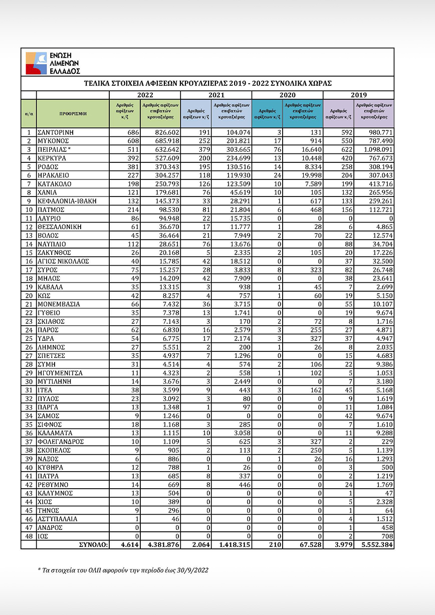 Έτος σταθμό για τον κλάδο της κρουαζιέρας, χαρακτηρίζει το 2022 η Ένωση Λιμένων Ελλάδος, όπου οι συνολικές προσεγγίσεις κρουαζιερόπλοιων σε 48 ελληνικά λιμάνια ανήλθαν σε 4.614 και ο αριθμός αυξήσεων επιβατών σε 4.381.876.