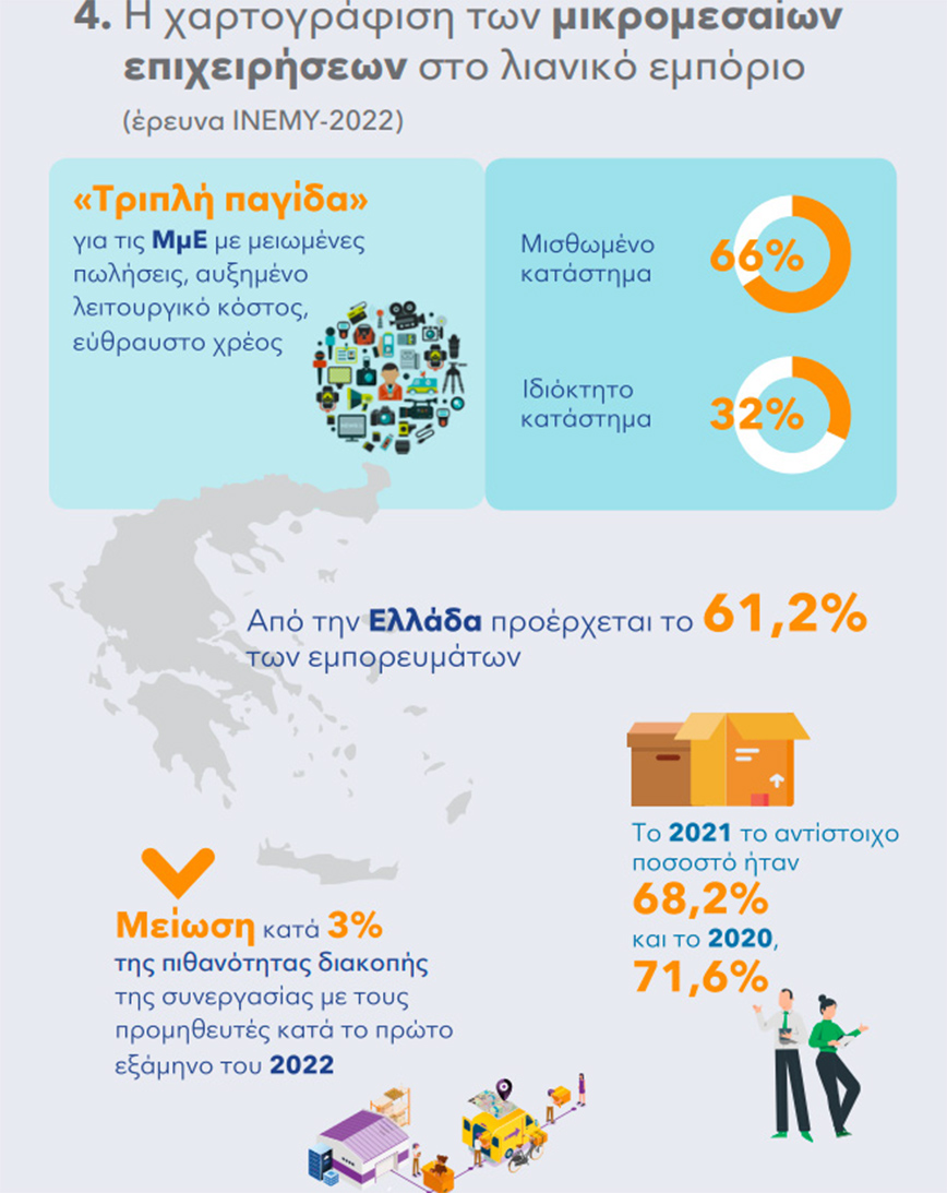 Από την αναλυτικότερη μελέτη των δεδομένων, προκύπτει ότι η όποια βελτίωση των μεγεθών του λιανικού εμπορίου δεν κατανέμεται ανάλογα μεταξύ των επιχειρήσεων του κλάδου. Σύμφωνα την πρωτογενή έρευνα του Ινστιτούτου Εμπορίου και Υπηρεσιών (ΙΝΕΜΥ), οι μικρότερες επιχειρήσεις, που αποτελούν και την συντριπτική πλειονότητα των εμπορικών επιχειρήσεων, μπορεί μεν να επιδεικνύουν μια σημαντική ανθεκτικότητα ωστόσο επιχειρούν να αποφύγουν την «τριπλή παγίδα»: