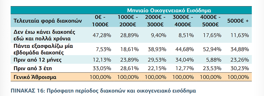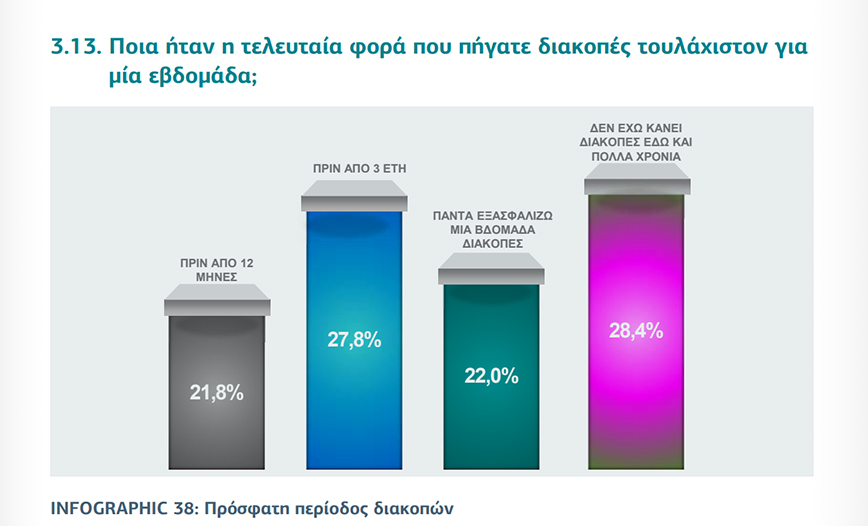 Το 56,2% δεν έχει κάνει διακοπές τουλάχιστον τα 3 τελευταία έτη ή και καθόλου. Σχεδόν 3 στους 10 καταναλωτές δεν έχουν κάνει διακοπές εδώ και πολλά χρόνια ενώ ομοίως στην ίδια κατάσταση βρίσκεται και το υπόλοιπο 27,8% που απέδρασε μόλις για μία εβδομάδα πριν από τρία έτη.