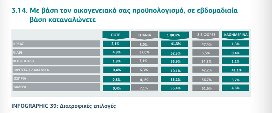 Σχετικά με τις διατροφικές συνήθειες, μία φορά την εβδομάδα μπορεί να καταναλώνει κρέας το 41,3%. Με βάση τον οικογενειακό τους προϋπολογισμό, ψάρι μία φορά την εβδομάδα καταναλώνει το 52,3%.