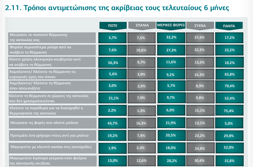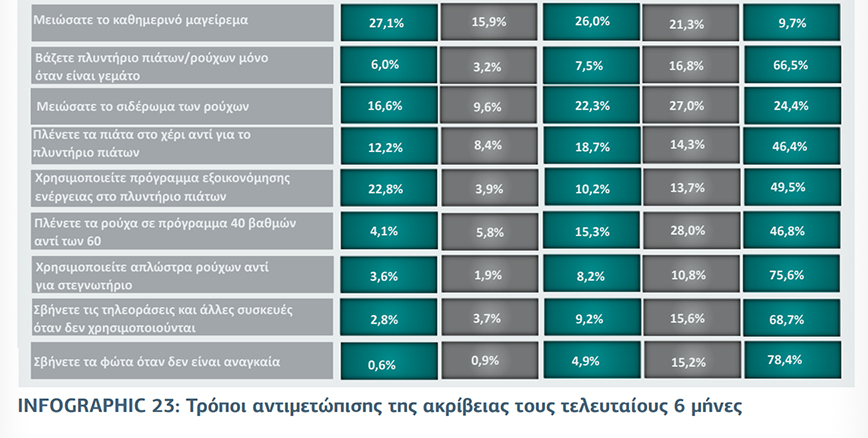 Σε ποσοστό 40%, οι καταναλωτές μειώνουν τις φορές που κάνουν μπάνιο ενώ οι περισσότεροι προτιμούν ένα γρήγορο ντους αντί για μπάνιο (73,5%). Στην ίδια λογική, μείωσαν και το σιδέρωμα ρούχων (73,7%) ενώ επιλέγουν να πλένουν τα πιάτα στο χέρι για να αποφύγουν τη χρήση του πλυντηρίου πιάτων (79,4%).