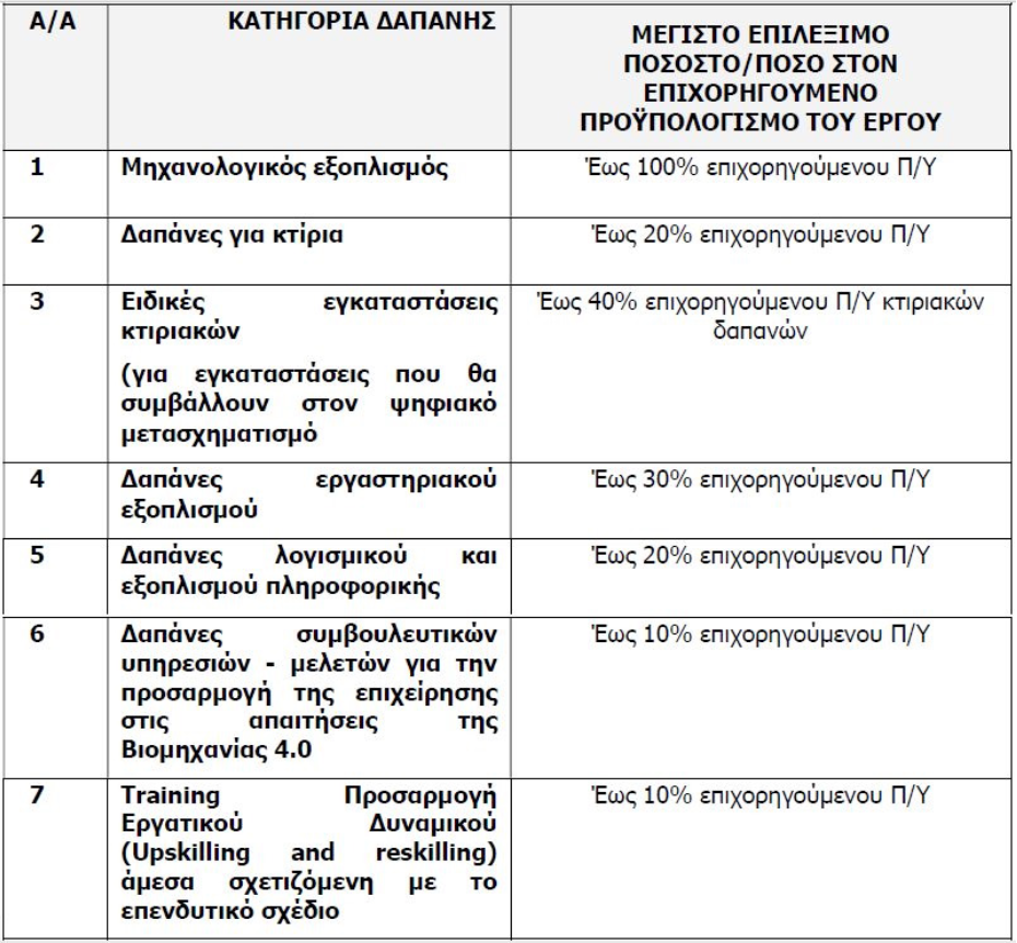Στο πλαίσιο του προγράμματος χρηματοδοτούνται επενδυτικά σχέδια με προϋπολογισμό από €250 χιλ. έως €6 εκατ., τα οποία μπορεί να περιλαμβάνουν δαπάνες για: