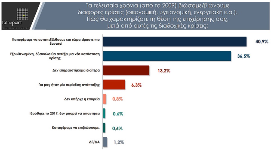 Το 40,9% των επιχειρήσεων δήλωσε ότι κατάφερε να αντεπεξέλθει στις αλλεπάλληλες συνθήκες αστάθειας που δημιούργησαν οι πολλαπλές κρίσεις από το 2009, ενώ σε ποσοστό 36,5% ανέφεραν ότι δύσκολα θα αντεπεξέλθουν σε μία νέα κρίση. Επιπλέον, το 13,2% των επιχειρήσεων απάντησε ότι δεν επηρεάστηκε ιδιαίτερα, ενώ το 6,3% δήλωσε ότι βίωσε περίοδο ανάπτυξης.