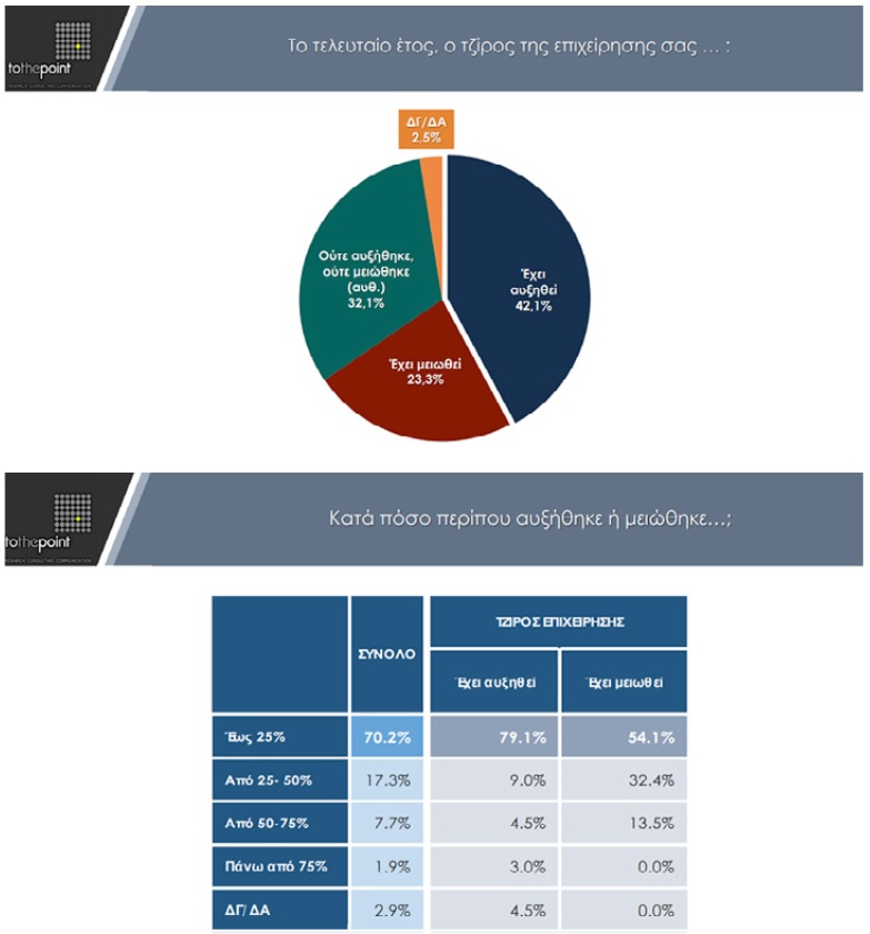 Αναφορικά με τον τζίρο, κατά το τελευταίο έτος, το 42,1% των ερωτηθέντων δήλωσε ότι αυξήθηκε, το 32,1% των επιχειρήσεων ανέφερε ότι ο τζίρος έμεινε αμετάβλητος και μόνο το 23,3% των επιχειρήσεων ανέφερε μειωμένο τζίρο