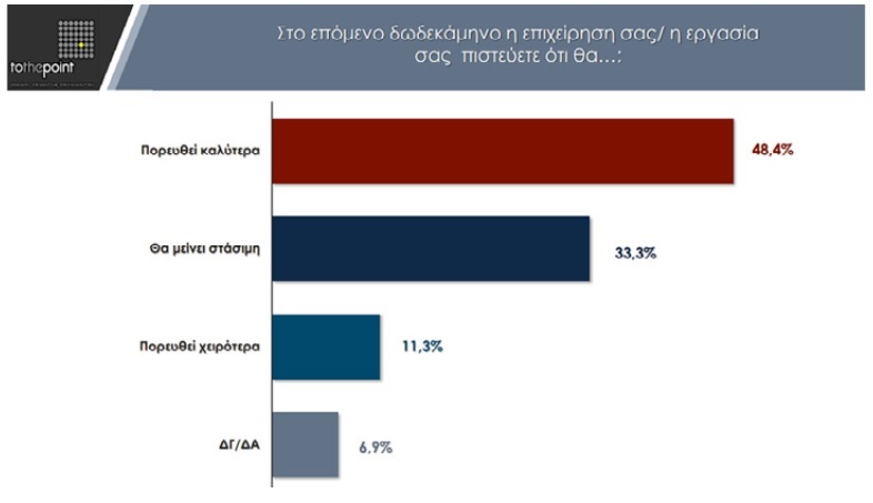 Σε ερώτηση για την πορεία της οικονομίας τους επόμενους δώδεκα μήνες, το 35,8% των επιχειρήσεων απάντησε ότι θα πορευθεί καλύτερα, το 24,5% των επιχειρήσεων θεωρούν ότι θα παραμείνει σταθερή, ενώ μόνο το 23,3% πιστεύει ότι η οικονομία θα πορευθεί χειρότερα. Τέλος, σχεδόν οι μισές επιχειρήσεις (48,4%) εκτιμούν ότι οι ίδιες θα πορευθούν καλύτερα τους επόμενους 12 μήνες, το 33,3% των επιχειρήσεων πιστεύει ότι δε θα υπάρξει κάποια αισθητή διαφορά, ενώ μόλις το 11,3% των επιχειρήσεων θεωρεί ότι η πορεία τους θα είναι χειρότερη.