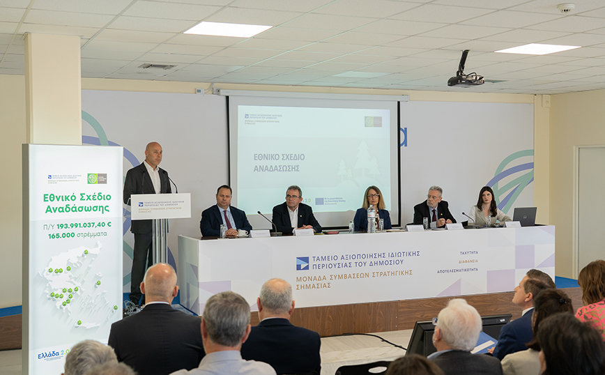 Τους βασικούς άξονες του Εθνικού Σχεδίου Αναδάσωσης παρουσίασαν στελέχη του ΤΑΙΠΕΔ και του Υπουργείου Περιβάλλοντος και Ενέργειας (ΥΠΕΝ), σε κοινή εκδήλωση που πραγματοποιήθηκε την Τετάρτη, 26 Απριλίου στο Ολυμπιακό Στάδιο, παρουσία του Υφυπουργού Περιβάλλοντος και Ενέργειας, Γιώργου Αμυρά, του Γενικού Γραμματέα Δασών, Κωνσταντίνου Αραβώση και του Εντεταλμένου Συμβούλου και Επικεφαλής της Μονάδας Συμβάσεων Στρατηγικής Σημασίας του ΤΑΙΠΕΔ, Παναγιώτη Σταμπουλίδη.