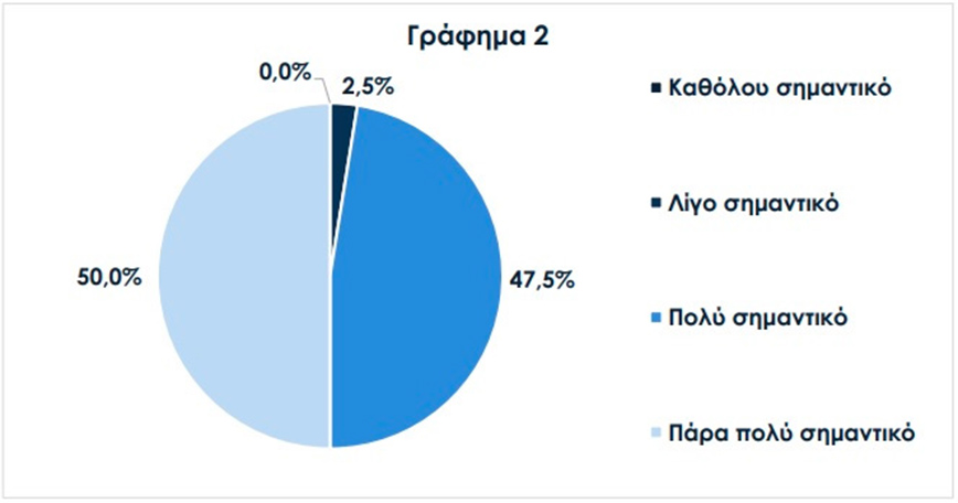 Καμία από τις επιχειρήσεις που συμμετείχαν στο ερωτηματολόγιο δεν αξιολογεί το πρόβλημα εξεύρεσης ανθρώπινου δυναμικού ως «καθόλου σημαντικό», ενώ το 2,5% το αξιολογεί ως «λίγο σημαντικό». Αντίθετα, το 47,5% το αξιολογεί ως πολύ σημαντικό, ενώ οι μισές επιχειρήσεις που συμμετείχαν στην έρευνα, δηλαδή το 50,0%, το αξιολογεί ως πάρα πολύ σημαντικό.