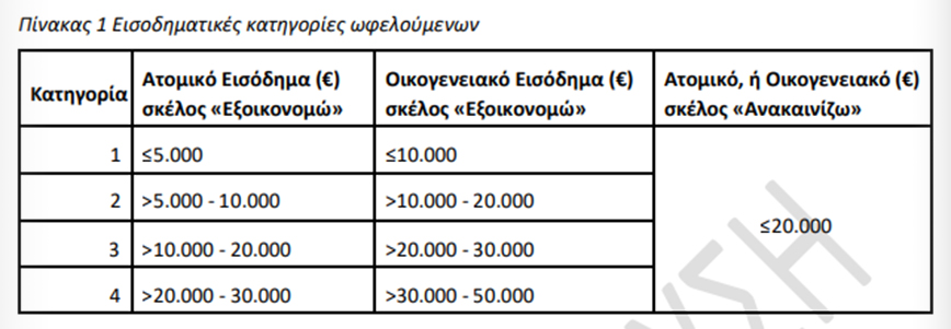Κατά την υποβολή αίτησης οι αιτούντες κατατάσσονται για τις ανάγκες του Προγράμματος στις παρακάτω εισοδηματικές κατηγορίες: