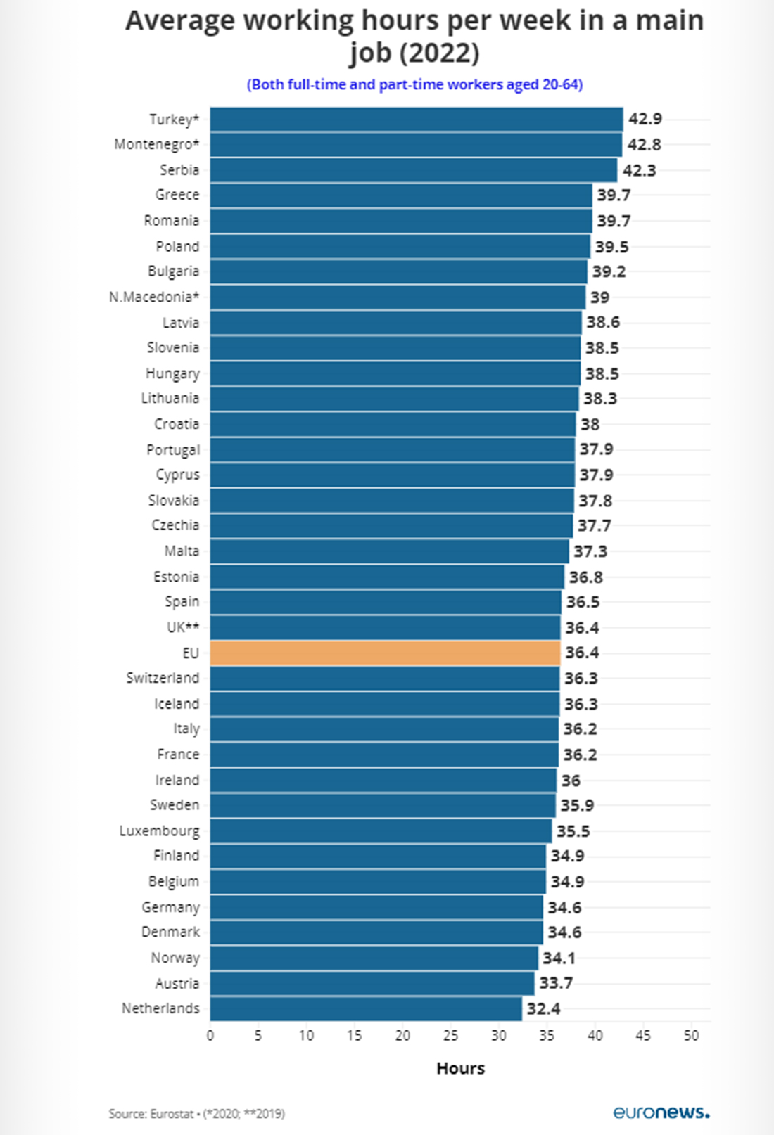 Το 2022, οι εργαζόμενοι στην ΕΕ ηλικίας 20-64 ετών εργάζονταν 36,2 ώρες κατά μέσο όρο την εβδομάδα. Αυτό ήταν 24 λεπτά λιγότερο από τα στοιχεία πριν από την πανδημία του 2019. Σύμφωνα με τα στοιχεία για εργαζόμενους πλήρους και μερικής απασχόλησης ηλικίας 20-64 ετών, οι εργαζόμενοι σε Ελλάδα και Ρουμανία είναι αυτοί που δουλεύουν τις περισσότερες ώρες στην Ευρωπαϊκή Ένωση (39,7 ώρες την εβδομάδα), ενώ οι εργαζόμενοι με τις λιγότερες εβδομαδιαίες ώρες εργασίας είναι οι Ολλανδοί (32,4 ώρες).