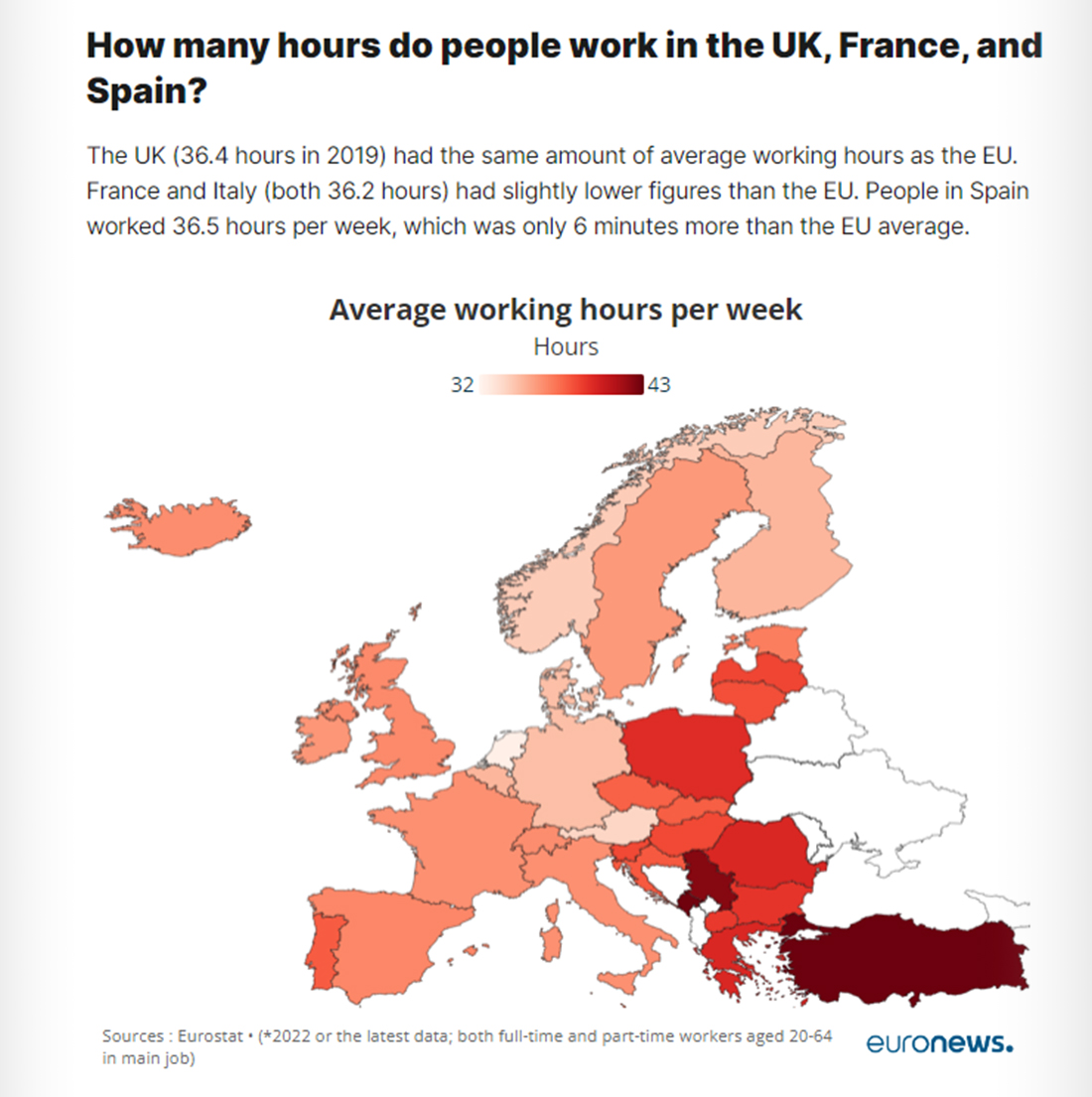 Στο Ηνωμένο Βασίλειο ο μέσος όρος εβδομαδιαίων ωρών εργασίας είναι ίδιος με τον μέσο όρο της ΕΕ (36,4 ώρες με στοιχεία του 2019). Η Γαλλία και η Ιταλία είχαν ελαφρώς χαμηλότερα ποσοστά από την ΕΕ με 36,2 ώρες την εβδομάδα.