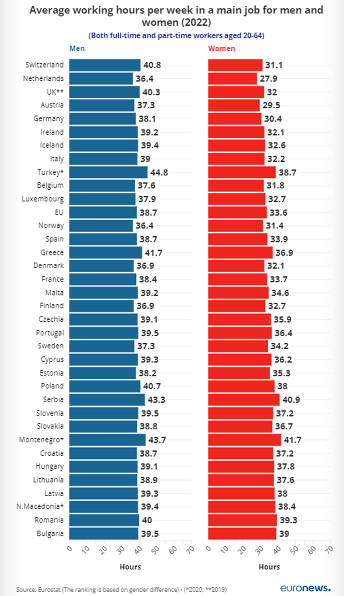 Μέσος όρος ωρών εργασίας την εβδομάδα για άνδρες και γυναίκες
