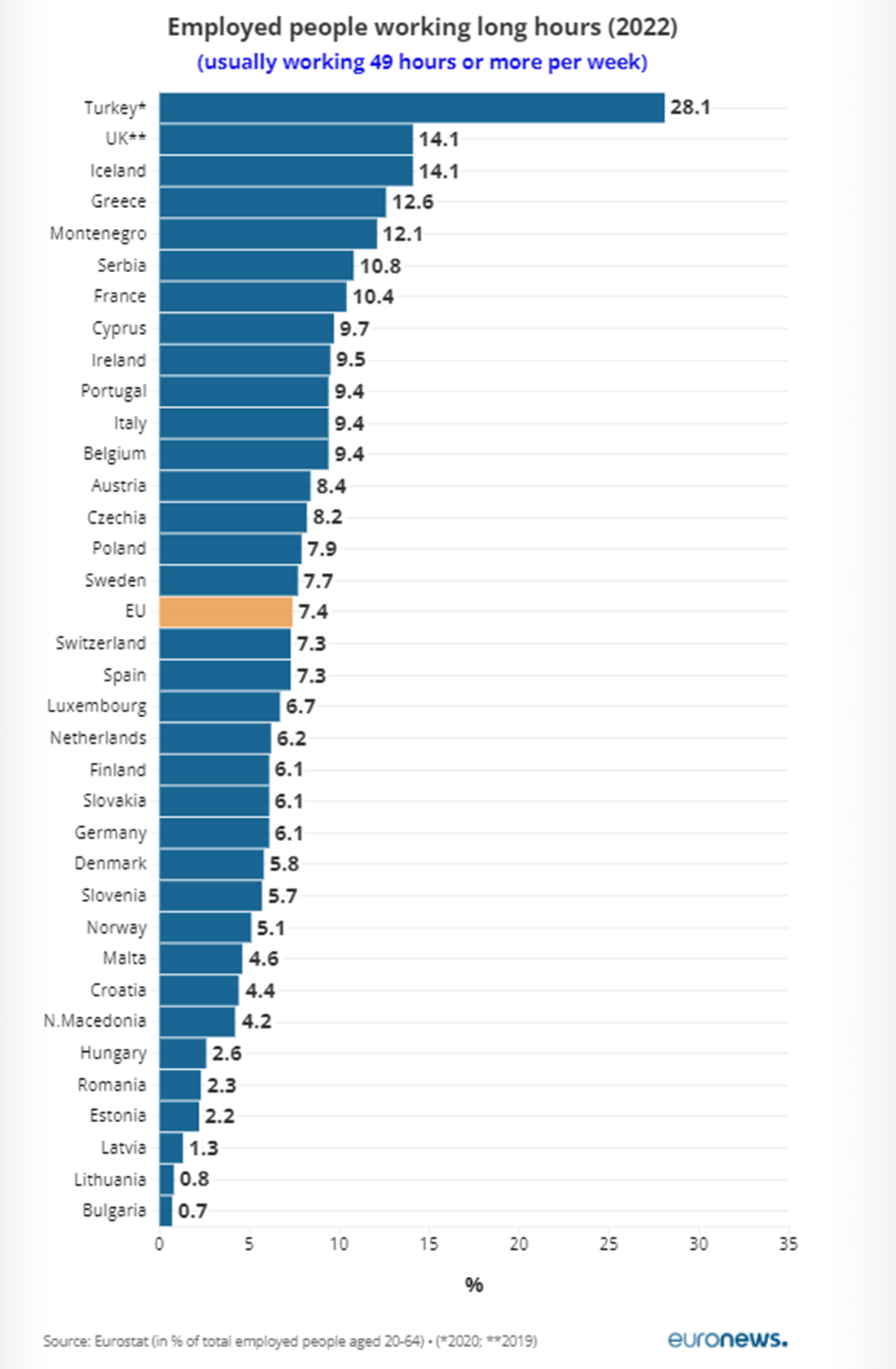 Το ποσοστό των απασχολουμένων, συμπεριλαμβανομένων πλήρους και μερικής απασχόλησης που συνήθως εργάζονται 49 ώρες ή περισσότερες την εβδομάδα, είναι ένας επίσης σημαντικός δείκτης, υπογραμμίζει το euronews. Στην ΕΕ, το 7,4% των απασχολουμένων εργάστηκαν πάνω από 49 ώρες την εβδομάδα. Την πρώτη θέση στη σχετική λίστα καταλαμβάνει και πάλι η Ελλάδα με 12,6% των απασχολούμενων, ενώ στην τελευταία βρίσκεται η Βουλγαρία με μόλις 0,7%. Όταν περιλαμβάνονται και άλλες χώρες της ευρωπαϊκής επικράτειας, εκτός ΕΕ, το υψηλότερο ποσοστό καταγράφεται στην Τουρκία με 28,1%, και ακολουθεί το Ηνωμένο Βασίλειο και η Ισλανδία με 14,1%.