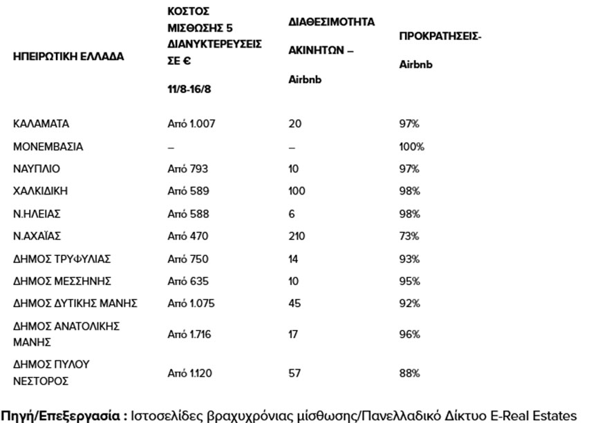 Στη Μονεμβάσια, καταγράφεται μηδενική διαθεσιμότητα ακινήτων προς μίσθωση για το πενθήμερο του Δεκαπενταύγουστου. Αξίζει να αναφέρουμε ότι η Μονεμβάσια διαθέτει σε πλατφόρμες βραχυχρόνιας μίσθωσης 353 αυτοτελής κατοικίες. Η «ξεχασμένη» τουριστικά Αχαΐα, με 943 (πλην των Καλαβρύτων) εγγεγραμμένα ακίνητα σε πλατφόρμες βραχυχρόνιας μίσθωσης. Η Αχαΐα προσπαθεί να ενταχθεί στον τουριστικό χάρτη της χώρα μας μέσω των παραθαλάσσιων περιοχών της Αιγιαλίτιδας ζώνης όπως το Λόγγο, τα Αραχωβίτικα, τα Σελιανίτικα καθώς και οι παραθαλάσσιες περιοχές του Δήμου Δυτικής Αχαΐας, όπως τη παραλία Γιανισκάρη και τη Καλόγρια, κερδίζουν τη προτίμηση των τουριστών τόσο εγχώριων όσο και αλλοδαπών τη φετινή σεζόν. Οι προ-κρατήσεις στην πλατφόρμα Airbnb αγγίζουν το 73% και το κόστος μίσθωσης κατοικίας για 5 διανυκτερεύσεις ξεκινά από 470 ευρώ.