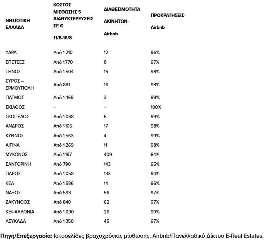 Το μικρότερο ποσοστό προ-κρατήσεων καταγράφεται στη Μύκονο. Συγκεκριμένα, οι προ-κρατήσεις για ακίνητα εγγεγραμμένα στη πλατφόρμα βραχυχρόνιας μίσθωσης Airbnb αγγίζει το 84% (94% πέρυσι) για το πενθήμερο 11/8-16/8, με τη διαθεσιμότητα να αγγίζει τα 409 ακίνητα. Το σύνολο της δυναμικής του νησιού σε πλατφόρμες βραχυχρόνιας μίσθωσης (διαμερίσματα/μονοκατοικίες, όχι ιδιωτικά δωμάτια) αριθμεί 3.849 ακίνητα, έναντι 3.536 τη περσινή χρονιά. Το συνολικό κόστος μίσθωσης για 5 διανυκτερεύσεις σε ακίνητο κατάλληλο για τετραμελή οικογένεια ή/και παρέα ξεκινά από 1.187€, έναντι των 1.736 ευρώ πέρυσι. Στην Σαντορίνη οι προ-κρατήσεις για τις ημέρες του δεκαπενταύγουστου αγγίζουν το 95% (98% πέρυσι), όσον αφορά τα εγγεγραμμένα ακίνητα στη πλατφόρμα Airbnb. H συνολική δυναμικότητα του νησιού σε αυτοτελείς κατοικίες (διαμερίσματα/μονοκατοικίες, όχι ιδιωτικά δωμάτια) εγγεγραμμένα σε πλατφόρμες βραχυχρόνιας μίσθωσης αριθμεί 4.078 ακίνητα, έναντι 3.690. Το κόστος μίσθωσης κατοικίας κατάλληλη για τετραμελή οικογένεια ή/και παρέα για 5 διανυκτερεύσεις ξεκινά από 790 ευρώ, έναντι 1.642 ευρώ πέρυσι.