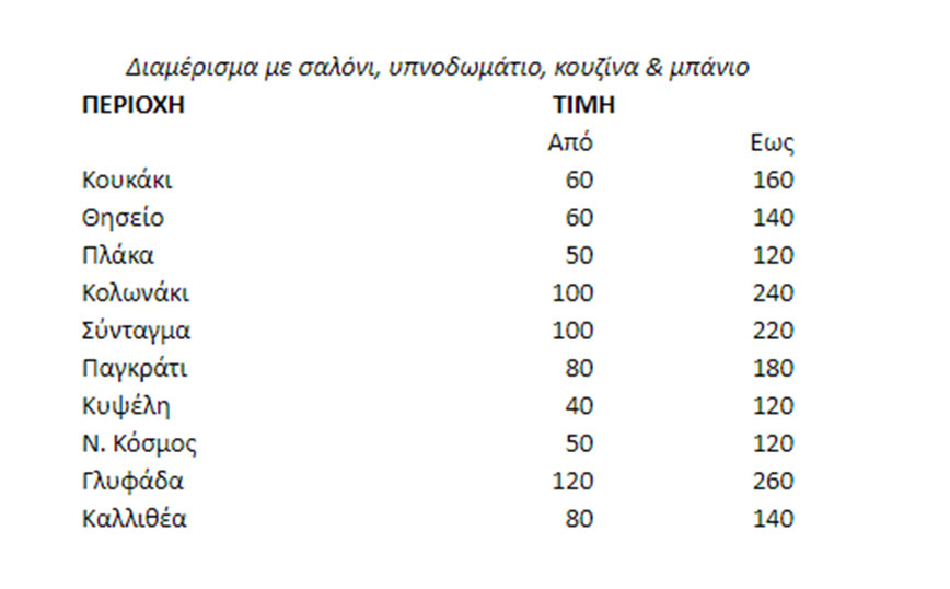 Ως δημοφιλέστερες περιοχές για τη φιλοξενία καταλυμάτων βραχυχρόνιας μίσθωσης προβάλλουν το Κουκάκι, το Θησείo, η Πλάκα, το Κολωνάκι και το Σύνταγμα. Σε περιοχές των νοτίων προαστίων, όπως ο Ν. Κόσμος, η Καλλιθέα και η Γλυφάδα, η τάση είναι επίσης ανοδική, ενώ εντυπωσιακή επίδοση καταγράφει και ο Πειραιάς. Η τιμή ανά διανυκτέρευση σε κατάλυμα της Airbnb στις παραπάνω περιοχές κυμαίνεται από 40 ευρώ έως 260 ευρώ και αφορά διαμέρισμα με σαλόνι, υπνοδωμάτιο, κουζίνα και μπάνιο. Είναι γεγονός ότι ο κλάδος των βραχυχρόνιων μισθώσεων αποτελεί λύση για οικογένειες που διαθέτουν περιορισμένο budget, σύμφωνα με ρεπορτάζ του Οικονομικού Ταχυδρόμου