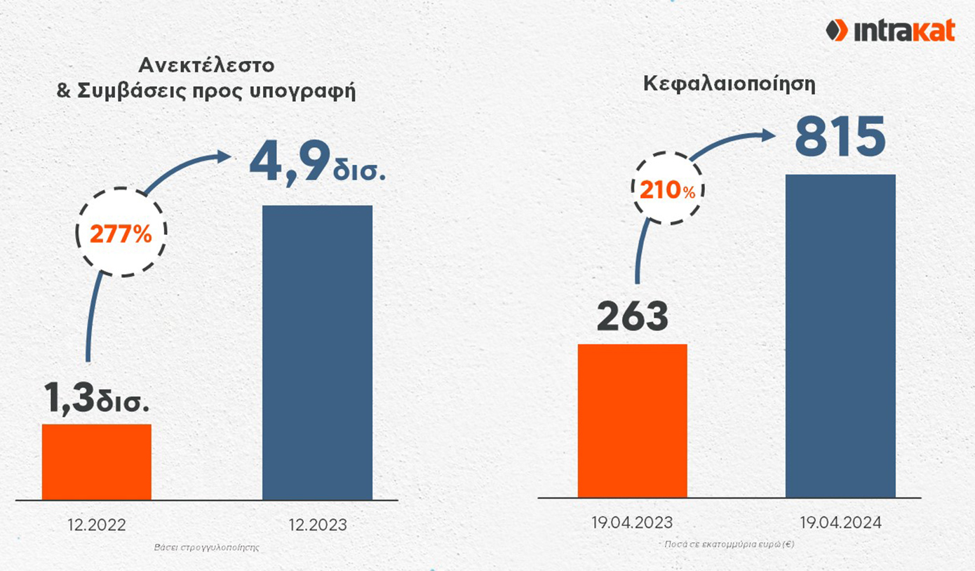 Μεγάλη αύξηση κατά €100 εκατ. περίπου κατέγραψαν τα ταμειακά διαθέσιμα του Ομίλου, τα οποία ανήλθαν σε €125 εκατ. έναντι €25 εκατ. στις 31.12.2022, ενώ αξίζει να σημειωθεί ότι ενισχύθηκαν εκτεταμένα και οι ενοποιημένες καθαρές λειτουργικές ταμειακές ροές, που ανήλθαν σε €77 εκατ. από €15 εκατ. το 2022. Οι εξαιρετικές οικονομικές επιδόσεις του Ομίλου απεικονίστηκαν στην κεφαλαιοποίηση της Intrakat, η οποία στις 19.04.2024 διαμορφώθηκε σε περίπου €815,5 εκατ., παρουσιάζοντας αύξηση της τάξης του 210% σε σχέση με ένα χρόνο πριν (19.04.2023).