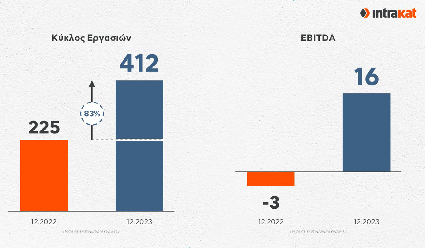 Έχοντας ολοκληρώσει την εξαγορά της Άκτωρ, η οποία ενσωματώνεται στα οικονομικά του αποτελέσματα για λιγότερο από δύο μήνες (08/11/2023 – 31/12/2023), ο Όμιλος Intrakat ενίσχυσε σημαντικά τα μεγέθη του, με τον ενοποιημένο κύκλο εργασιών να ανέρχεται σε €412 εκατ. έναντι €225 εκατ. το 2022, σημειώνοντας αύξηση της τάξης του 83%.