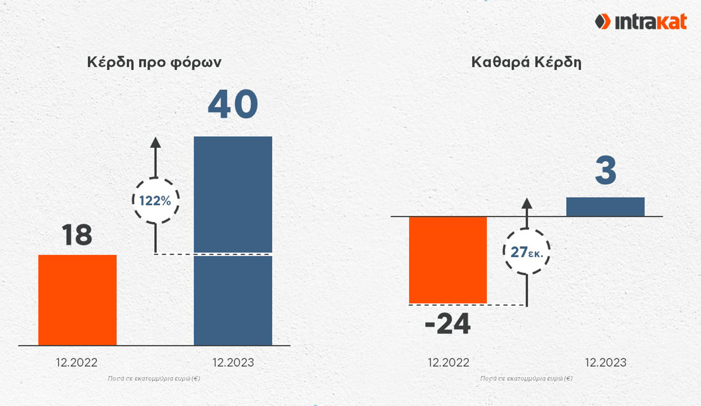 Ο Όμιλος Intrakat συνέχισε με αποφασιστικότητα την υλοποίηση του στρατηγικού σχεδιασμού του και πέτυχε ισχυρές επιδόσεις σε όλους τους τομείς δραστηριότητας, με κατακόρυφη αύξηση του κύκλου εργασιών, καθαρή κερδοφορία €3 εκατ. και λειτουργική κερδοφορία €16 εκατ. και πολλαπλασιασμό του ανεκτέλεστου, σύμφωνα με τα οικονομικά αποτελέσματα για το 2023, που δημοσιεύθηκαν σήμερα.