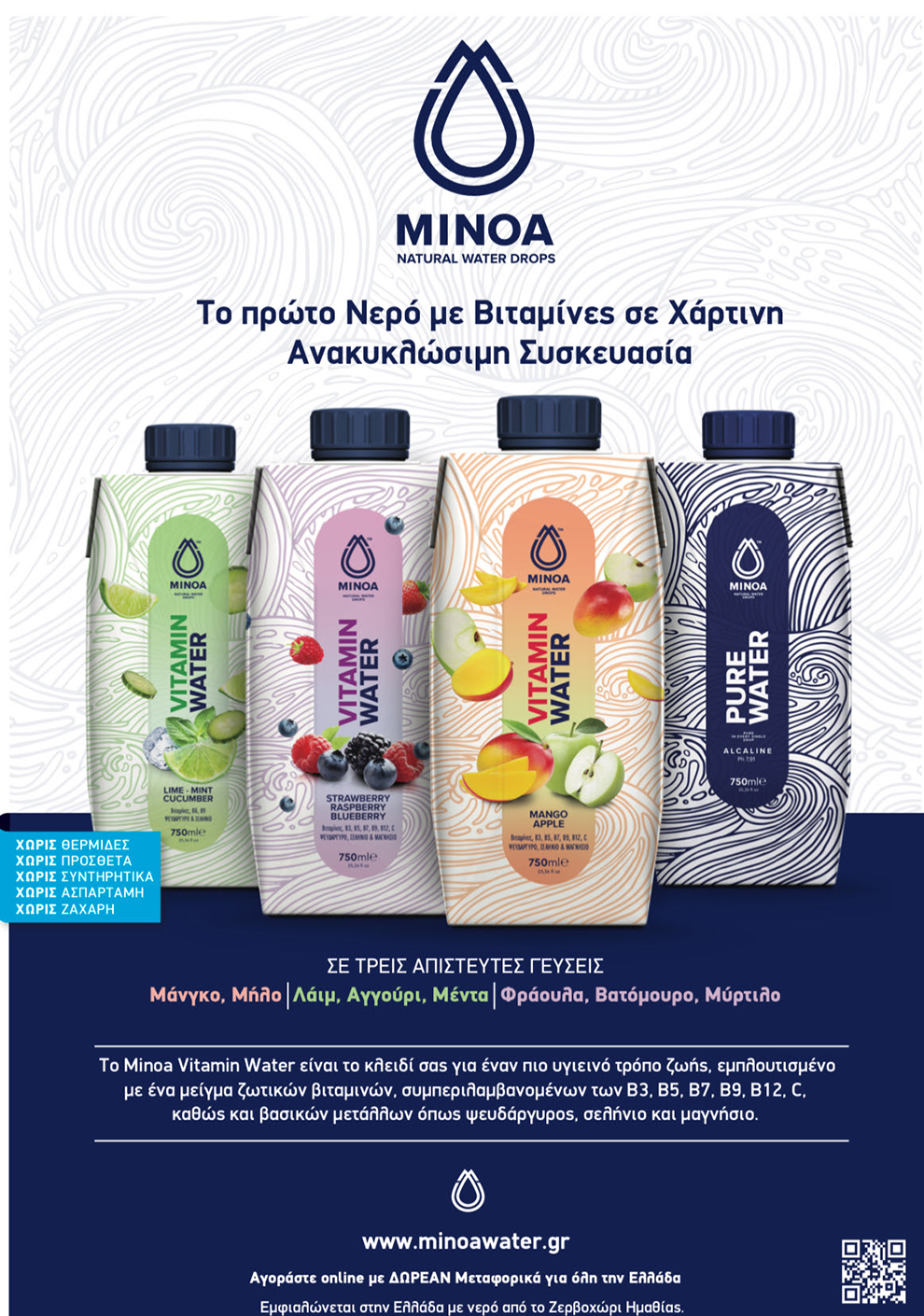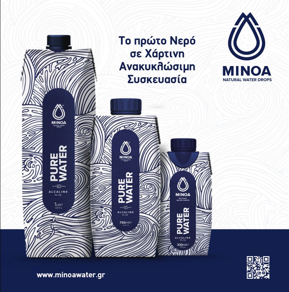 Το νέο Packaging, το οποίο απέσπασε το βραβείο “Top Export Packaging”, αποτελεί ακόμα μία ένδειξη της δέσμευσης του Minoa Water για την προστασία του περιβάλλοντος. Όλες οι συσκευασίες Minoa Waterείναι εμπνευσμένες από την Ιαπωνία, σχηματίζοντας τον κύκλο ζωής και τον κύκλο νερού. Το Minoa Water έχει αφιερώσει μεγάλη προσοχή στη βιώσιμη ανάπτυξη, επενδύοντας στον σχεδιασμό και τα υλικά. Κυκλοφόρησε στην αγορά το πρώτο ελληνικό νερό που συσκευάζεται σε ανακυκλώσιμη χάρτινη συσκευασία από φυτικά υλικά, αξιοποιώντας το νερό από το Ζερβοχώρι Ημαθίας. Η υψηλή περιεκτικότητα σε ασβέστιο και μαγνήσιο, χωρίς την παρουσία βαρέων μετάλλων και οργανικών φυτοφαρμάκων, αποτελεί τα βασικά στοιχεία που καθιστούν το προϊόν μοναδικό.