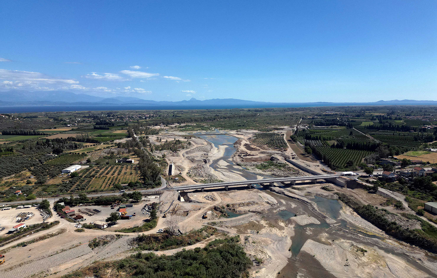 Για την υδραυλική προστασία της γέφυρας από τη χειμαρρώδη λειτουργία του ποταμού, γίνονται παρεμβάσεις στις όχθες και την κοίτη σε μήκος 580 μέτρα ανάντη και 500 μέτρα κατάντη, με προστατευτικά αναχώματα και καθοδηγητικούς τοίχους από οπλισμένο σκυρόδεμα, ενώ σε απόσταση 250 μέτρων κατάντη κατασκευάζεται αναβαθμός μήκους 242 μέτρων και ύψους 6 μέτρων για τη δημιουργία λεκάνης ηρεμίας και ελέγχου των νερών προς αντιμετώπιση των φαινομένων ακραίων καιρικών συνθηκών.