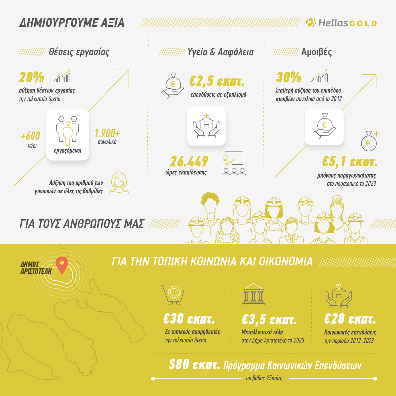 Αξίζει τέλος να αναφερθεί ότι, η Ελληνικός Χρυσός εκτός από τη δημιουργία θέσεων εργασίας και την υλοποίηση κοινωνικών δράσεων και έργων, ενισχύει σημαντικά τον Δήμο Αριστοτέλη και μέσω της ετήσιας απόδοσης μεταλλευτικών τελών στο Ελληνικό Δημόσιο. Συγκεκριμένα, το 40% αυτών των τελών διοχετεύεται στο Δήμο Αριστοτέλη για την ενίσχυση των βασικών υποδομών του, καθώς και για αναπτυξιακά έργα που θα αποτελέσουν παρακαταθήκη για τις μελλοντικές γενιές, ακόμη και μετά το πέρας της μεταλλευτικής δραστηριότητας. Μόνο για το 2023, ο Δήμος Αριστοτέλη εισέπραξε 3,5 εκατ. ευρώ από τα μεταλλευτικά τέλη της εταιρείας, κάτι που αποτελεί το 95,6% του συνόλου των εσόδων υπέρ Δήμων από εκμετάλλευση μεταλλείων σε όλη την Ελλάδα.