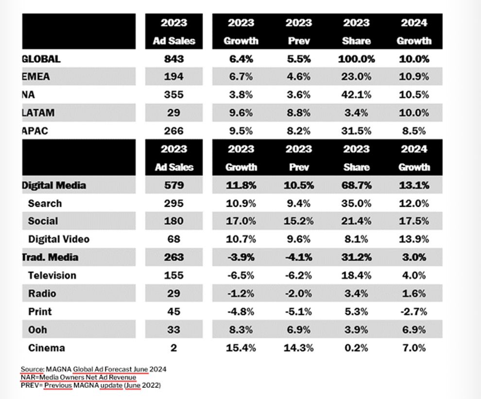 Η MAGNA, στο τελευταίο report της που δημοσιεύτηκε στις 17 Ιουνίου 2024, προβλέπει ότι η παγκόσμια διαφημιστική επένδυση στα Μέσα θα φτάσει το 2024 στα $927 δις, σημειώνοντας +10% αύξηση σε σχέση με το 2023 ($843 δις), αύξηση μεγαλύτερη από το +6,4% που είχαμε το 2023.