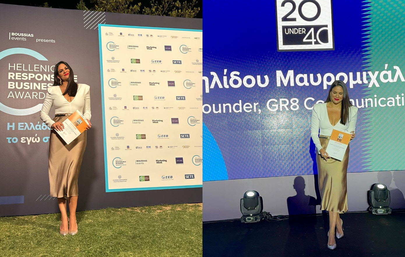 Σε μια λαμπρή τελετή στα Hellenic Responsible Business Awards 2024, που πραγματοποιήθηκαν στο Μουσείο Οίνου, βραβεύτηκε η Τίνα Μιχαηλίδου, ιδιοκτήτρια της GR8 Communication και δημοσιογράφος του ΣΚΑΪ, καθώς μπήκε στη λίστα “20 under 40 PR” ανάμεσα στους 20 καλύτερους στις δημόσιες σχέσεις κ την επικοινωνία, κάτω των 40 ετών. Ίδρυσε την εταιρία της σε ηλικία μόλις 35 ετών και κατάφερε σε πολύ σύντομο χρονικό διάστημα να συνεργαστεί με πολύ μεγάλες εταιρίες και να αναλάβει project επικοινωνίας και δημοσίων σχέσεων που ξεχώρισαν για το έργο, την αποδοτικότητα, την πρωτοτυπία, την καινοτομία και τις ιδέες της.