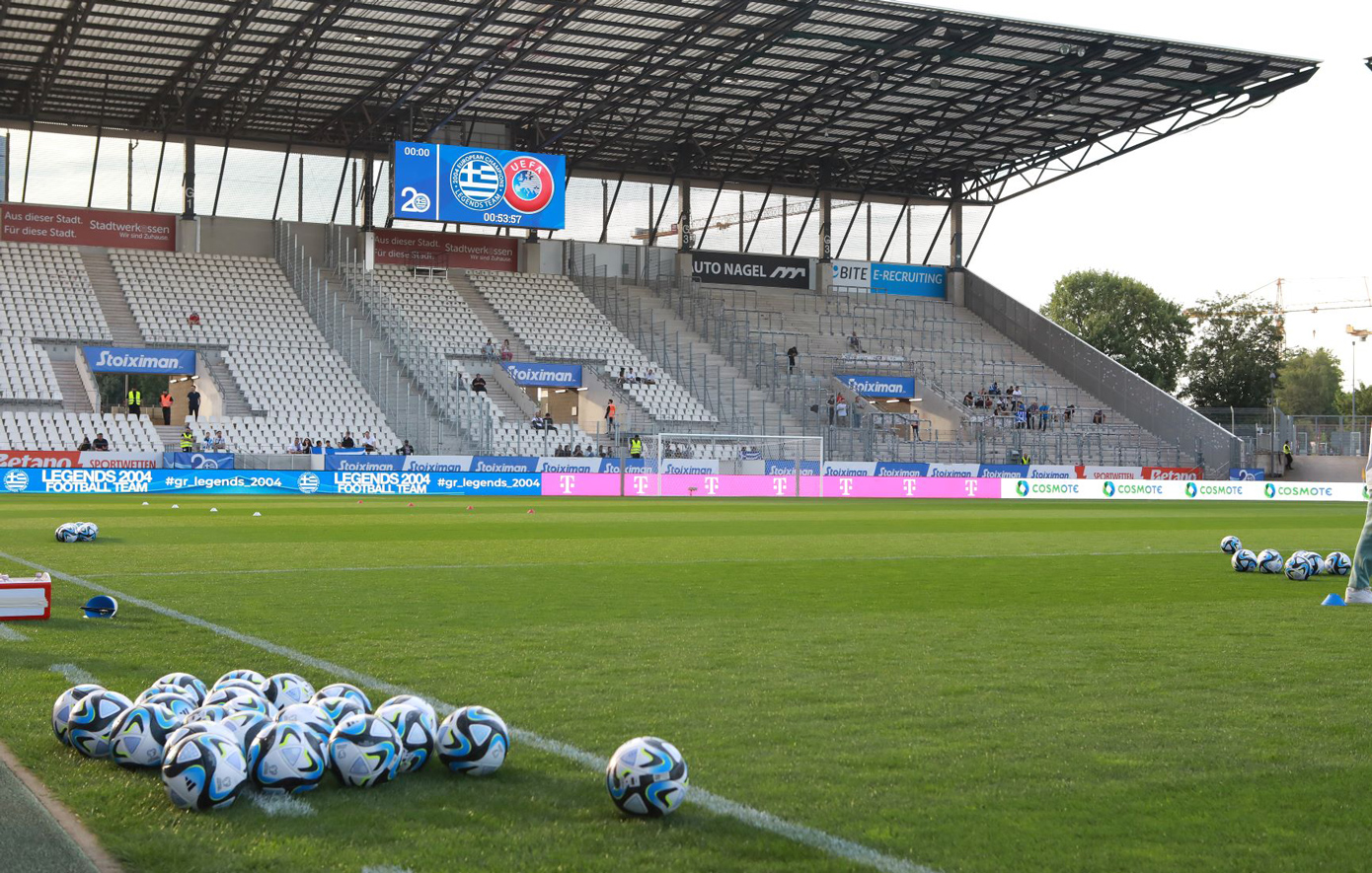 Χορηγοί του φιλικού αγώνα ανάμεσα στους Legends 2004 και την ομάδα των UEFA All Stars ήταν η COSMOTE και η Telekom, στηρίζοντας τη μεγάλη γιορτή της συμπλήρωσης 20 χρόνων από την κατάκτηση του EURO 2004. Ο αγώνας πραγματοποιήθηκε την Πέμπτη 11 Ιουλίου στο Έσσεν της Γερμανίας, τη γενέτειρα του Ότο Ρεχάγκελ, με την COSMOTE TV να αναλαμβάνει την παραγωγή και την αποκλειστική μετάδοσή του.