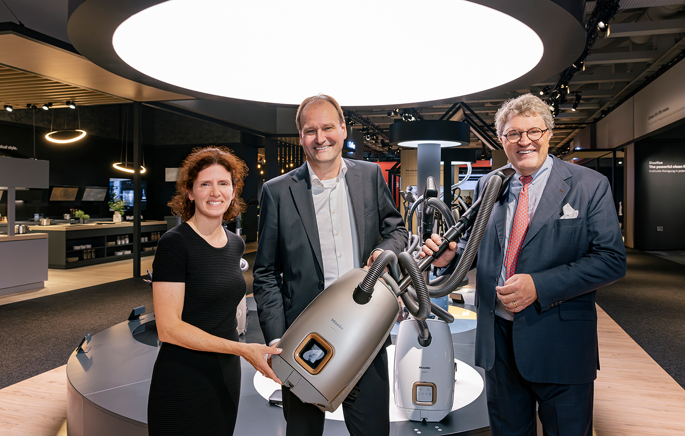 Στην IFA 2024, η Miele παρουσιάζει τη νέα γενιά κυλινδρικών ηλεκτρικών σκουπών «Guard» – θέτοντας νέα πρότυπα άνεσης και σχεδιασμού. Το Guard L1 είναι το πλήρως ανασχεδιασμένο μοντέλο με πολλές δυνατότητες που καλύπτουν τις υψηλότερες απαιτήσεις. Στη φωτογραφία: ο Dr. Markus Miele (κέντρο), ο Dr. Reinhard Zinkann (Διευθύνοντες Σύμβουλοι) και η Rebecca Steinhage (Εκτελεστική Διευθύντρια Ανθρώπινων Πόρων και Εταιρικών Υποθέσεων) – παρουσίασαν σήμερα τα κυριότερα σημεία της έκθεσης στη συνέντευξη Τύπου της εταιρείας στην IFA.